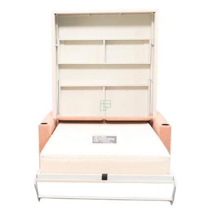This wall bed also includes built in shelves on the panel, ideal for books, décor, lighting, or daily essentials. In addition, the headboard features small storage compartments, allowing easy access to items like phones, chargers, glasses, or bedtime accessories. These storage elements enhance usability without adding visual clutter.